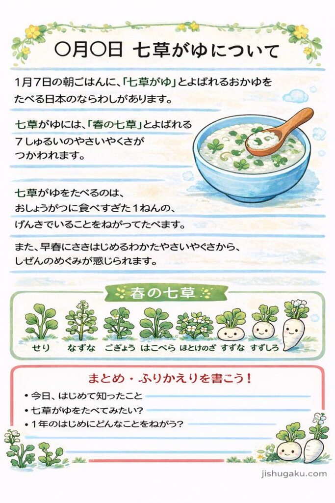今回は、1月の自主学習ノートにぴったりな行事、「七草がゆ」についてまとめていきます。